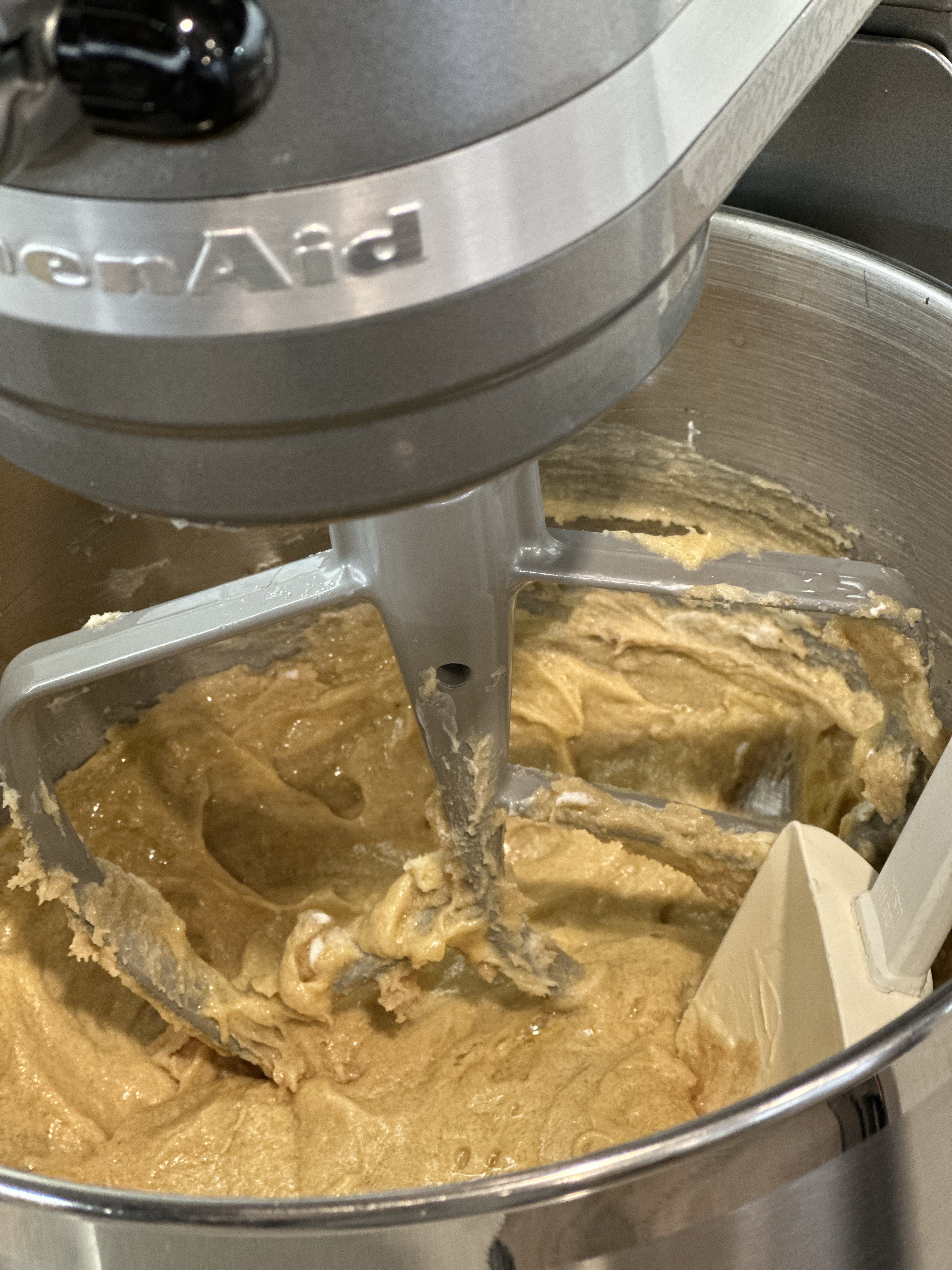 Small chunks of butter & shortening beat with sugars until fluffy.