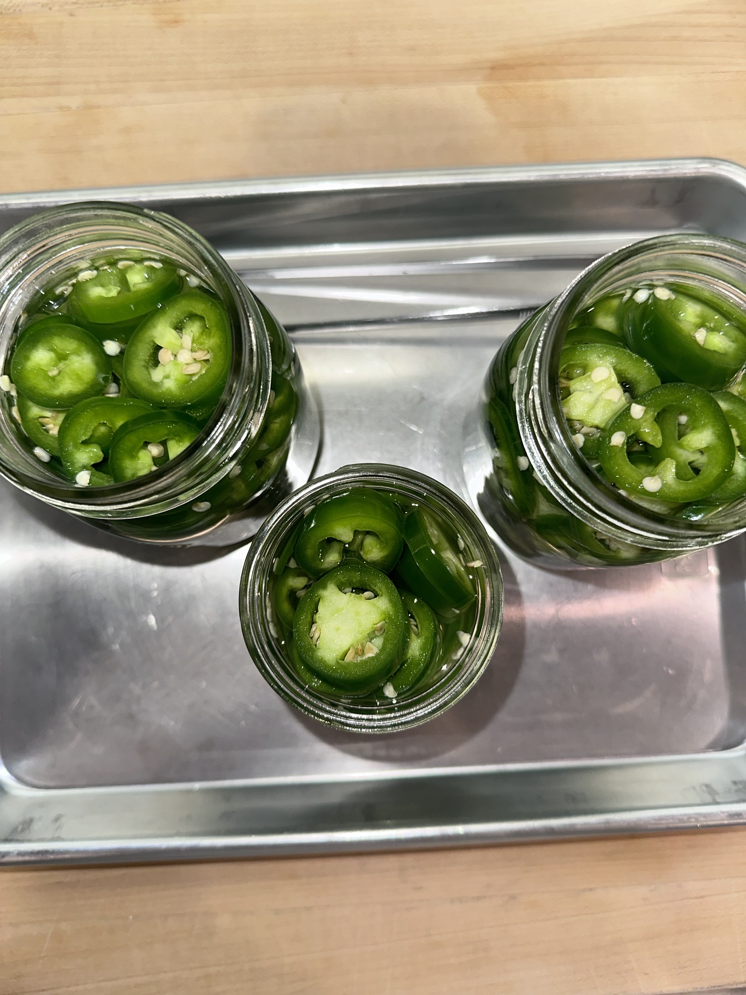 - Pour the hot mixture into the jars over the jalapenos. Let cool completely.
