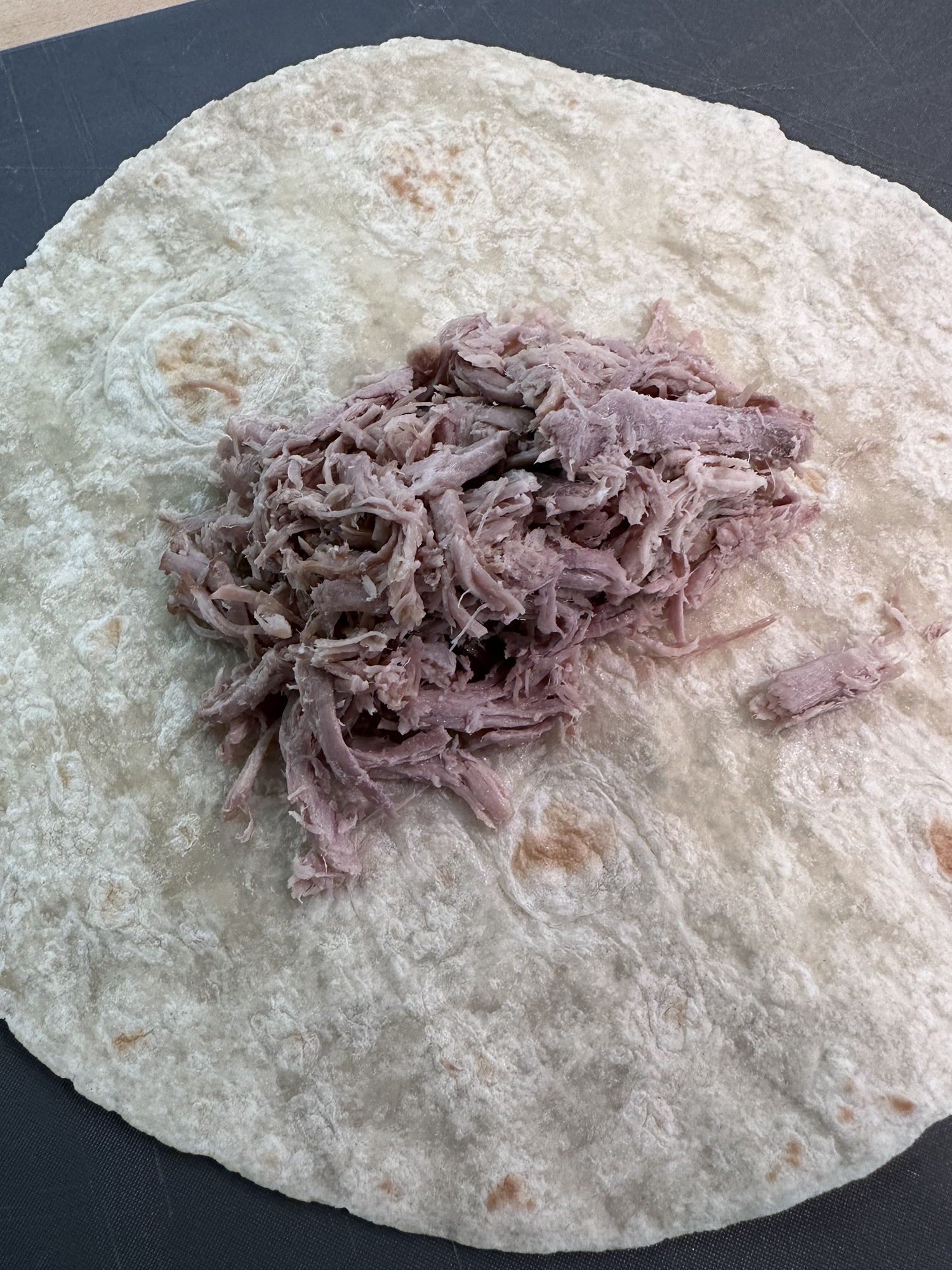 - Place a tortilla on a flat surface and place 1/2 – 1 cup (or more) of shredded pork. Fold the tortilla over the meat on 2 sides then roll placing the seam side down. Repeat. Place all the burritos into the baking dish. I suggest a roasting pan with high sides.