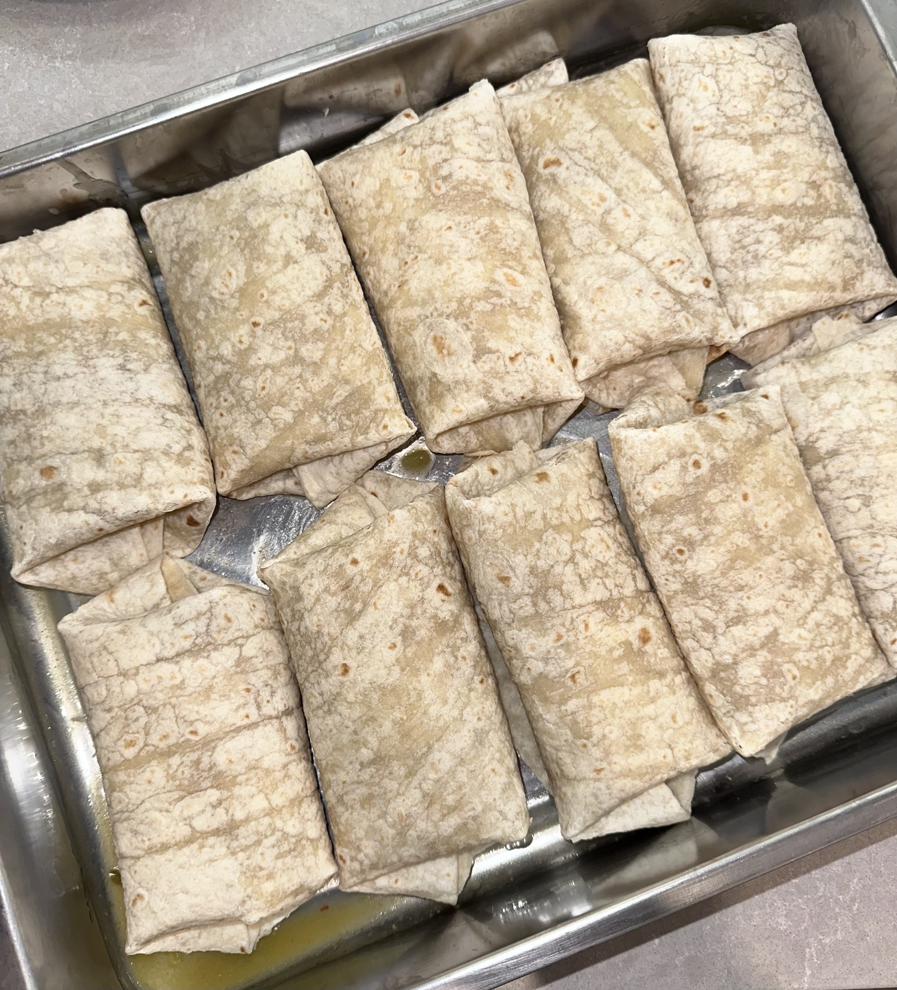 BIG TIP. I use a deep roasting pan. Make sure there is enough room for the burritos and sauce. If you go to the top, you will have an overflowing mess.