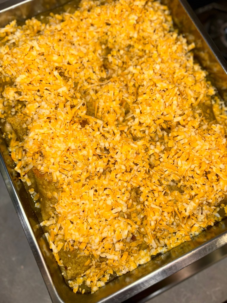 *TIP. If you are planning on making these ahead, I suggest covering the pan with foil and putting in the refrigerator without the green chili sauce. I will pour the sauce on the burritos just before baking.