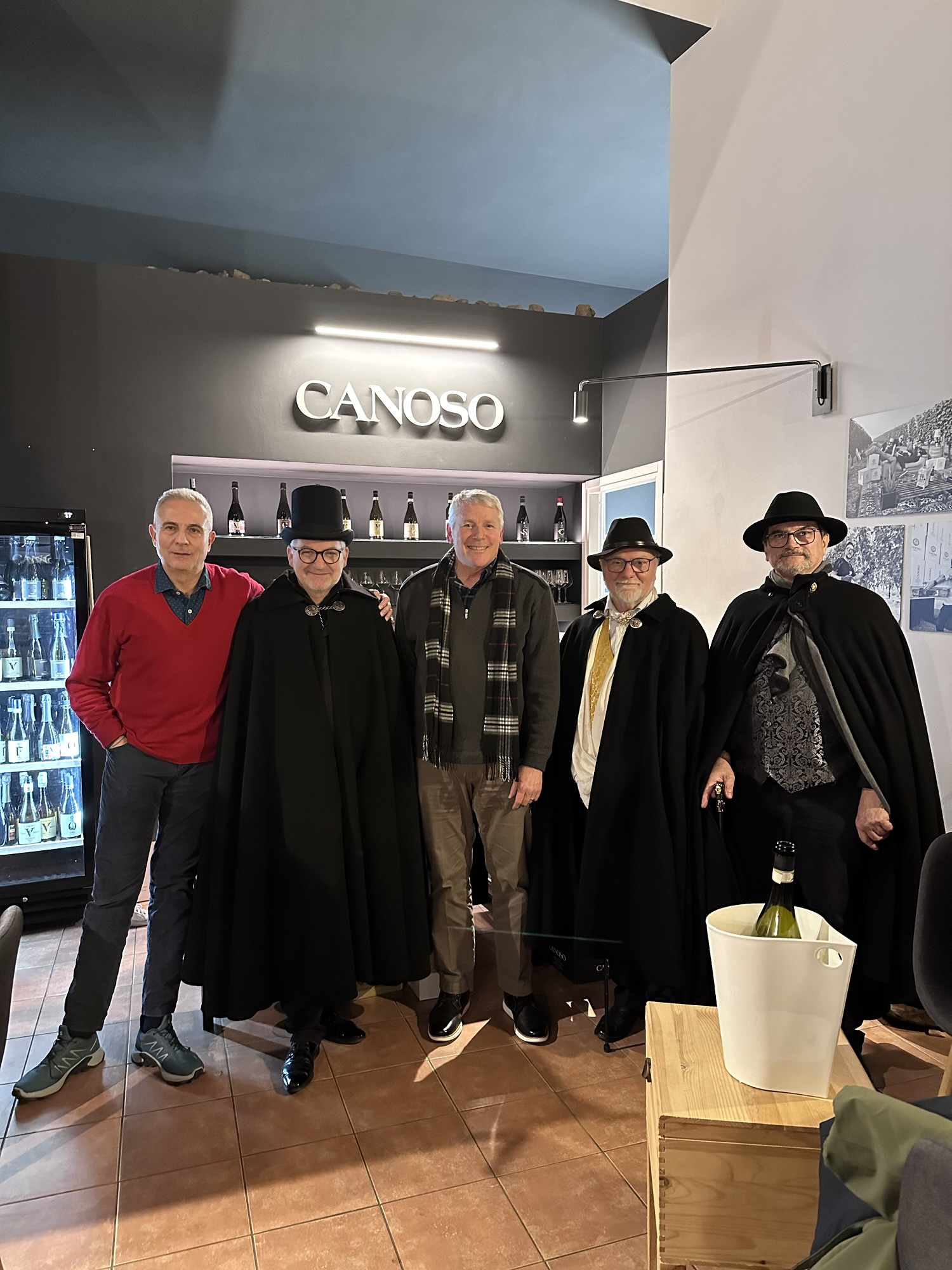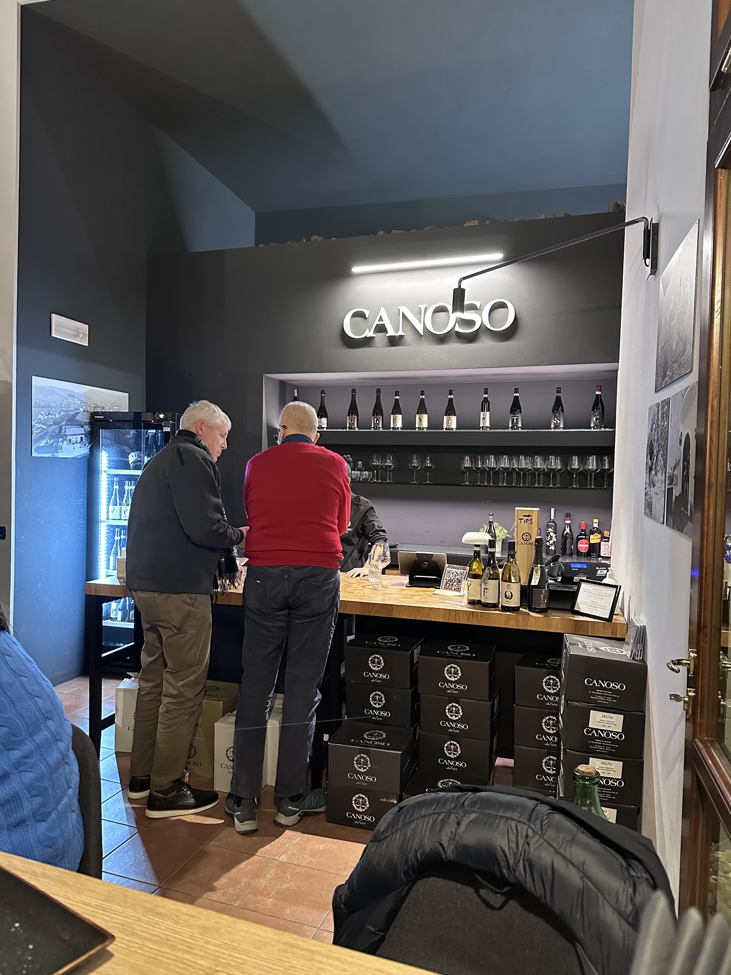 We are in Italy in mid-November. There are holiday displays appearing and these gentlemen carolers stopping in for a wine tasting. John and Massimo discussing wine selections at the bar. Perfect ending to a perfect day!