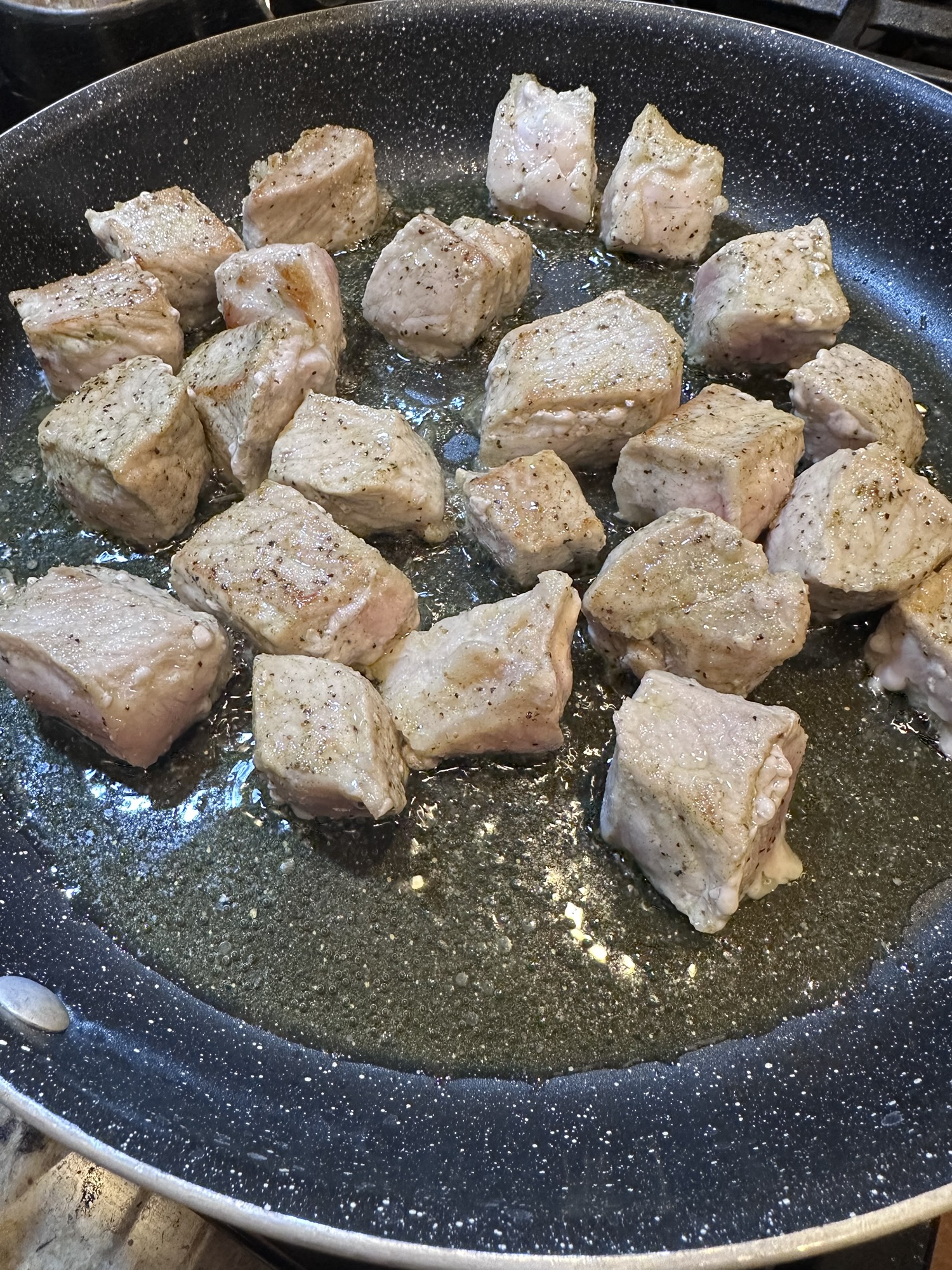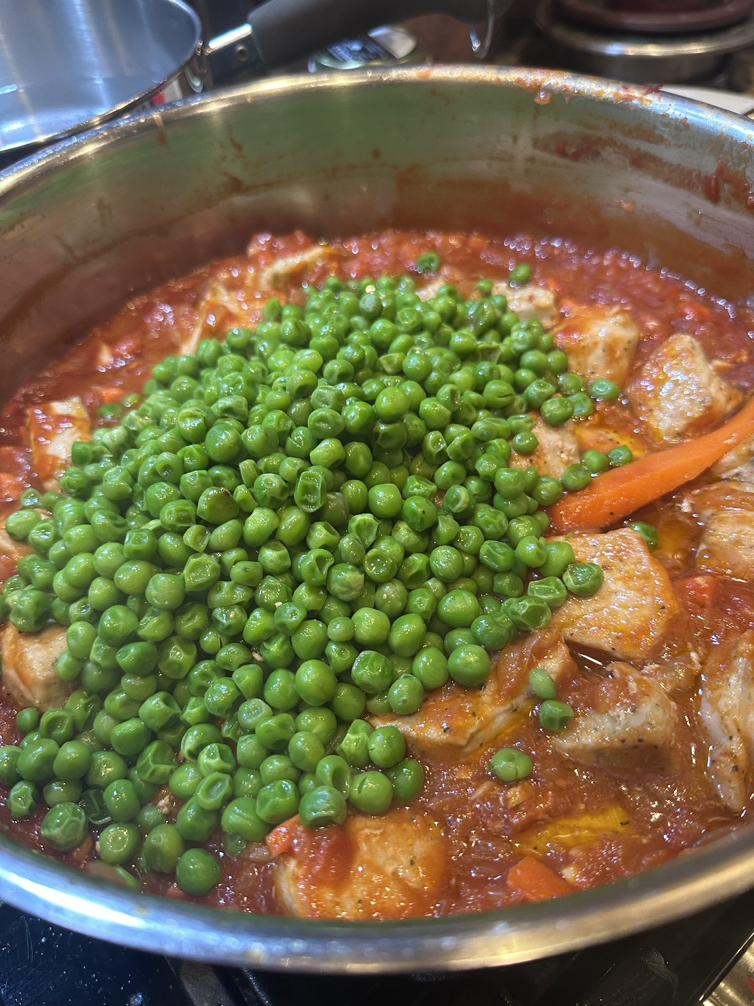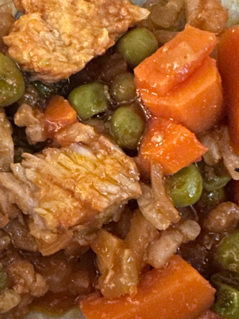 Pork is in, added peas (we love frozen), mom made a little rice. Sorry no pictures of rice.